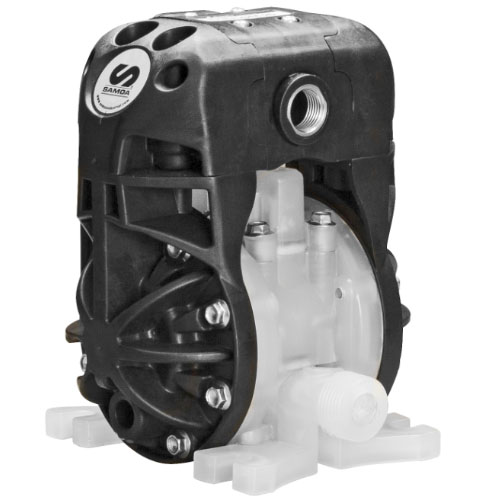 Luftbetriebene Doppelmembranpumpen zum Dosieren und Umpumpen einer Vielzahl von Flüssigkeiten. Für OEM-Anwendungen und Industrieprozesse mit niedrigeren Durchflussmengen. Der Luftmotor mit nicht ausgeglichenem Steuerventil benötigt einen niedrigeren Startdruck, was eine genauere Durchflussanpassung mittels Regelung des Luftdrucks ermöglicht. Die medienberührenden Materialien der Pumpe sind für die aggressivsten Flüssigkeiten und den Einsatz in korrosiven Umgebungen geeignet. Der Luftmotor (pneumatisches Wegeventil und Luftkammerabdeckungen) besteht aus Polypropylen. Für den Einsatz in explosionsgefährdeten Bereichen sind vollständig erdungsfähige Pumpen mit ATEX-Zertifizierung erhältlich (Ex II2 GD IIB/IIC 95 ?C). Übersetzungsverhältnis: 1:1 Max. freie Fördermenge*: 20 l/min. (5 US gal/Min.) Fördermenge pro Hub (ca.)*: 0,03 Liter (0,008 US gal) Fördermenge je Zyklus (2 Hübe)*: 0,06 Liter (0,016 US gal) Luftdruck-Betriebsbereich: 1,5 bis 7 bar (22 bis 100 psi) Max. Größe der Feststoffe in Suspension: 2 mm (3/32 Zoll) Max. Trockenansaughöhe*: 2 m (6 1/2 Fuß) Max. Nassansaughöhe*: 7 m (23 Fuß) Gewicht :1,2 kg (2,65 lb) Anschluss Saugseite Innen: 1/4 Zoll BSP (F) / Außen: 3/4 Zoll NPT (M) Anschluss Druckseite Innen: 1/4 Zoll BSP (F) / Außen: 3/4 Zoll NPT (M) Luftanschluss: 3/8 Zoll NPSM (F) Materialien der medienberührenden Teile Siehe Tabelle |