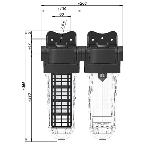 Filtertyp: SL240 DUO-CTN - Anschlüsse: ¾ Zoll - Durchfluss: 0,5 m³/h bei 0,2 bar delta P - Betriebsdruck: 8 bar, max. Druck: 12 bar - Max. Betriebstemperatur: 50°C - Filterkopf: Glasfaser verstärktes Polypropylen (PP) - Filterglocke: StyreneAcrylonitrile(SAN) - O’Ring: Nitril Butadien Rubber (NBR) - Filterschlüssel: ABS - Filterstützkorb: PP + 20% GF - Zentrifuge und Abschlussdeckel: Polyethylen (PE) - Filtervliese: Polyester (nicht waschbar) oder Nylon (waschbar) - Filterfläche + Volumen: 440cm² mit Vliesen + 0.57L mit Aktivkohle - CTN-Aktivkohlekartusche: SAN 0.6mm + PP mit 20% GF (Abschlussdeckel) 0.3mm - Serienmäßige Ausstattung: Filterfliese 25 Mikron, mit Aktivkohle befüllte CTN-Kartusche, Schlüssel, 2 Wandbefestigungen aus PP + 30% GF - Sonstige verfügbare Feinheiten: Nicht waschbar: 1 5 10 25 50 100 Mikron Waschbar: 150 300 Mikron |