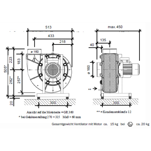Direktgetriebener Radialventilator zur Förderung aggressiver Gase, Temperatur max 40°C Gehäuse aus PPs, in gespritzter Ausführung mit integrierten Dichtungssystem, bestehend aus Kondensatwehr als umlaufende Tropfkante und einer Labyrinthdichtung, Kondensatablaufstutzen an der tiefsten Gehäusestellung Laufrad mit rückwärtsgekrümmten Schaufeln aus PPs, in gespritzter Ausführung mit Rückenbeschaufelung für garantierten Unterdruck an der Wellendurchführung im Betrieb, Gehäusestellung GL, Ausblasrichtung 45° / 90° / 135° / 180° / 270° / 315° /360° Grundrahmen: Stahl-verzinkt Antrieb : Normmotor 3 x 230/400V, 50 Hz, IP55, Wärmeklasse F, mit Thermokontakt Zubehör : Gummi -Schwingungsdämpfer Volumenstrom m3/h 240 - 1700 Druckdifferenz PA 990 - 390 Schutzart PTC (Kaltleiter) Polzahl 2 Sync. Drehzahl bei 50 Hz 3000 1/min Motorleistung kW 0,37 Nennstrom bei 400 V 1,1 A Baugröße 71 Bauart B5 / IP55 |
