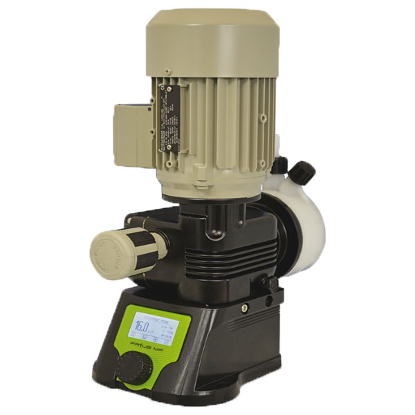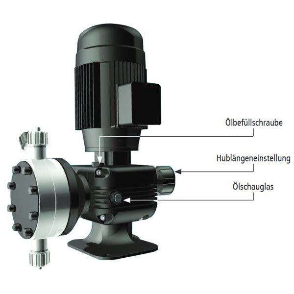 | PRIUS MOTOR  MEMBRANDOSIERPUMPEPRIUS ist eine elektrisch angetriebene Membrandosierpumpe mit variabler Änderung der Förderleistung durch eine manuelle Einstellung der Dosierhublänge. PRIUS-Pumpen verfügen über eine hocheffiziente Kraftübertragung. Zusammen mit einer hervorragenden chemischen Beständigkeit der medium berührten Teile sind sie für einen großen Anwendungsbereich bestens geeignet. TECHNISCHE DATENFörderleistungen: von 12 bis 530 l/h Drücke: von 5 bis 10 bar Betriebsbereich: 0...45°C Förderleistung: stufenlos verstellbar über Hublänge von 0 bis 100 % Dosierköpfe und Ventile: in PVDF / PP / AISI316L / PVC Dosierköpfe: mit Handentlüftungsventil Membrane: aus PTFE Getriebegehäuse: aus Aluminium, Epoxy-beschichtet Spannungsversorgung: wahlweise Wechsel- oder Drehstrom Frequenz: Motoren für 50 Hz oder 60 Hz Schutzart: IP54 FUNKTIONSPRINZIPMotor-Membrandosierpumpen der Serie Prius sind zur Förderung von flüssigen, feststofffreien Medien bestimmt. Durch eine Auswahl unter verschiedenen Werkstoffen für die mediumberührten Teile ist die Förderung auch aggressiver Medien möglich Mit Hilfe eines Elektromotors wird über ein Exzentergetriebe und eine Schubstange eine alternierende Hubbewegung erzeugt. Die Schubstange verformt eine flexible Membrane, die in dem sog. Dosierkopf eingebaut ist. Der Vorwärtshub erfolgt durch die Schubstange, der Rückwärtshub wird durch eine Feder bewerkstelligt. Die Hubfrequenz ist konstant und wird durch die Drehzahl des Elektromotors und die Übersetzung des Exzentergetriebes bestimmt. Der Hubweg (Hublänge) und die Hubfrequenz bestimmen somit die Förderleistung der Pumpe. Mittels einer Stellschraube, welche in einem Bereich von 0 ... 100% verstellbar ist, kann die Förderleistung verändert werden. Durch den Rückwärtshub der Membrane wird durch das Rückschlagventil Medium von unten in den Dosierkopf gesaugt. Sobald sich der Rückwärtshub in den Vorwärtshub umkehrt, schließt das Rückschlagventil und die Membrane drückt das Medium mit dem Vorwärtshub durch das Rückschlagventil nach oben aus dem Dosierkopf wieder heraus. bei der Umkehr von Vorwärtshub zu Rückwärtshub schließt sich das Rückschlagventil wieder und verhindert dadurch, dass das herausgedrückte Medium in den Dosierkopf zurückgesaugt wird. die Membrane saugt stattdessen wieder Medium durch das Rückschlagventil von unten an. |
