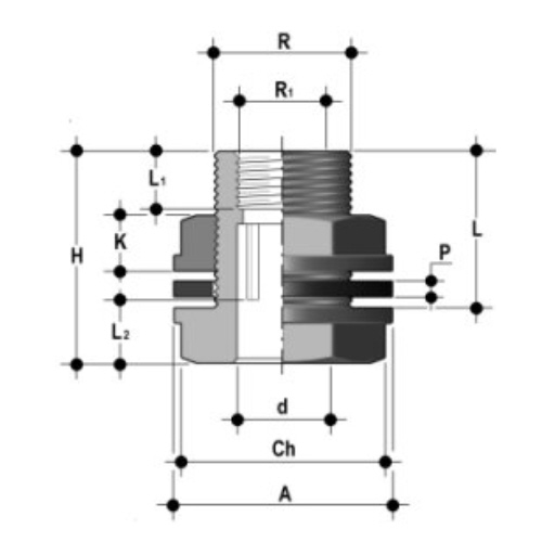| - Anschluss: mit Klebemuffe (d), Gewindestutzen (R) und Gewindemuffe (R1) mit Kontermutter - Dichtung: FPM |
