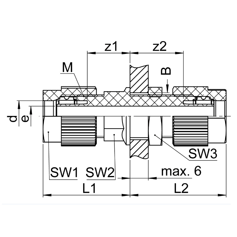 Gerade Schottverschraubung aus PVDF, Typ SO 21521, Durchführungslänge max. 6 mm